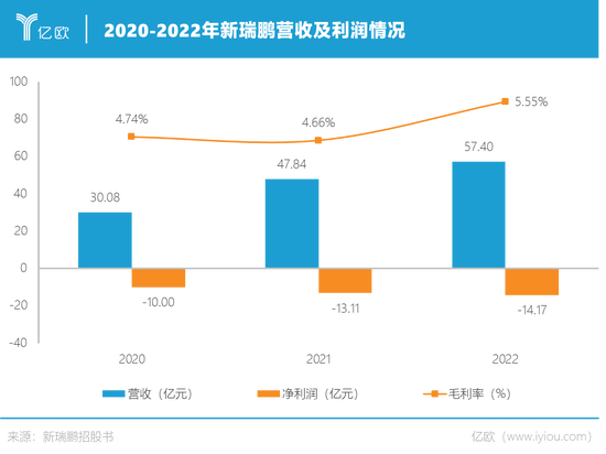即便近年来营收持续增长,新瑞鹏依然连年亏损且亏损逐渐扩大。招股书显示,2020-2022年新瑞鹏净亏损分别为10.00亿元、13.11亿元、14.17亿元,三年累计亏损近40亿元;报告期内,其整体毛利率只有5%上下,和此前挂牌新三板时披露的30%相差甚远。