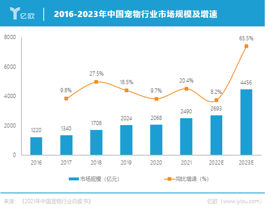 《2021年中国宠物行业白皮书》显示,中国城镇家庭宠物猫的数量为5806万只、宠物犬的数量为5429万只,合计超过1.1亿只;2021年全国城镇宠物消费市场规模达到2490亿元,预计到2023年将进一步增长至4456亿元。