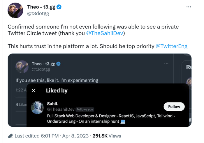 流媒体平台Twitch创始人兼前工程师Theo Browne接受TechCrunch采访时指出,“推特似乎完全无法做到在向用户提供内容时滤掉私人帖子。”