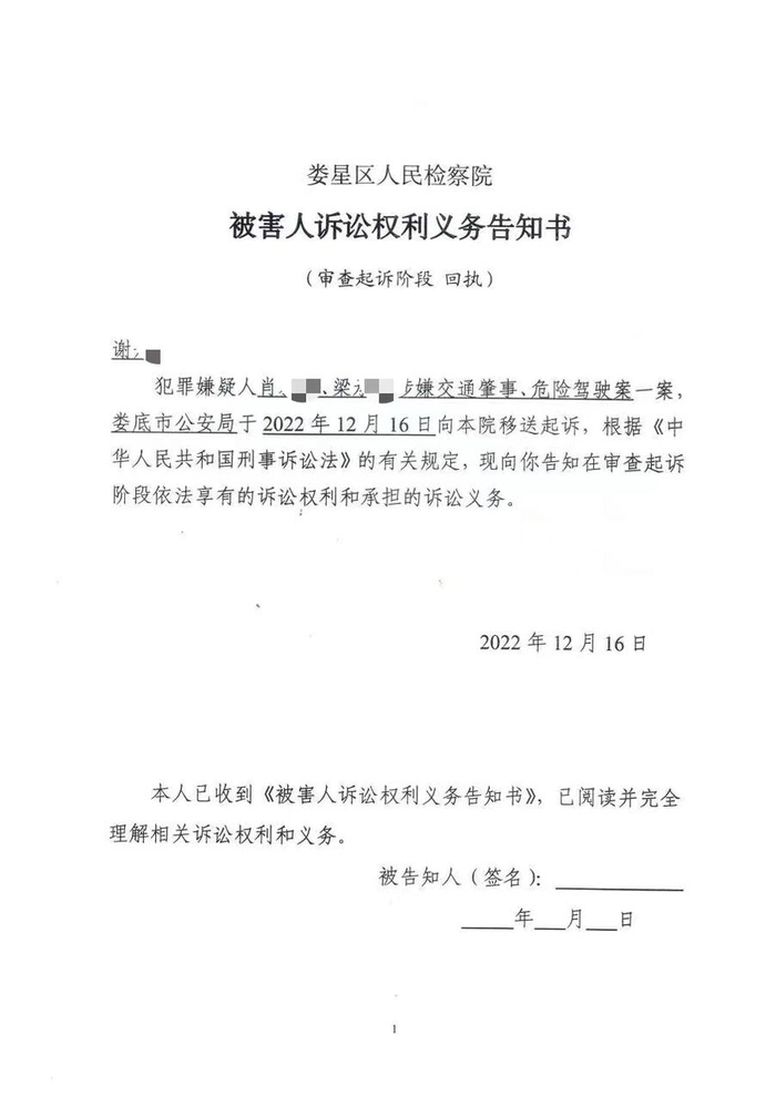 谢先生告诉澎湃新闻,此前他们收到的娄星区检察院《被害人诉讼权利义务告知书》显示,该案为犯罪嫌疑人肖某某、梁某某涉嫌交通肇事、危险驾驶案。
