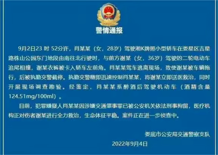 娄底市公安局交警支队直属一大队出具的《道路交通事故认定书》显示,2022年9月2日23时52分,肖某某醉酒驾驶湘K牌照宝马车以每小时69公里的速度(超速38%),由南往北行驶至娄底市娄星区吉星路珠山公园东门地段时,轿车左前裙与前方谢某驾驶的电动自行车尾部相撞,谢某的裤子被轿车左前照灯灯脚卡住,肖某某非但不停车,反而驾车逃离,将谢某拖行至吉星路中奥加油站地段时,被执勤交警截停查获。事发时,肖某某血液内酒精含量124.51mg/100ml。