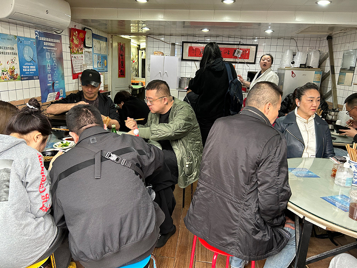 3月31日,“老地方面馆”内,顾客围坐在三张大圆桌前。
