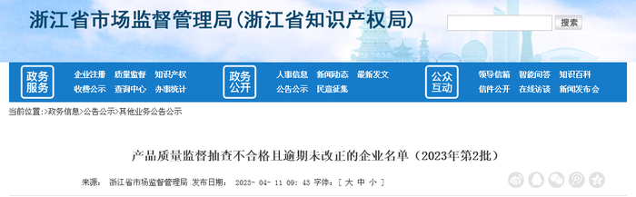 中国质量新闻网讯 2023年4月11日,浙江省市场监督管理局网站公布产品质量监督抽查不合格且逾期未改正的企业名单(2023年第2批)。