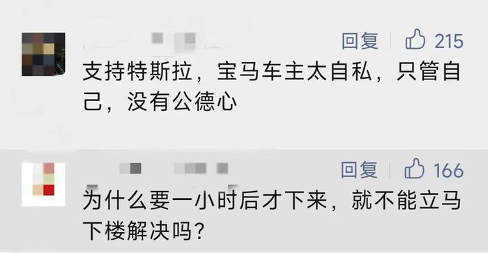 其中一位特斯拉车主通过114等平台联系宝马车主,在长达3小时内都没有结果,才最终有了“以车堵车”的一幕,此后有网友将燃油车主及家人现场视频发布在多个平台,最终引起热议。