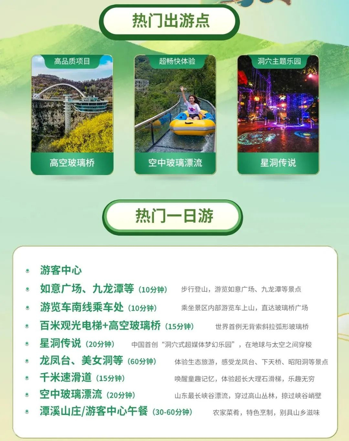 你可以在迎宾瀑布观水花飞溅,在九龙潭与美女峰,体验“景不醉人人自醉”的逍遥;在星洞传说看繁星闪烁,领略漫天星辰的浪漫;在空中玻璃漂流赏山花烂漫,心动一整个春天。