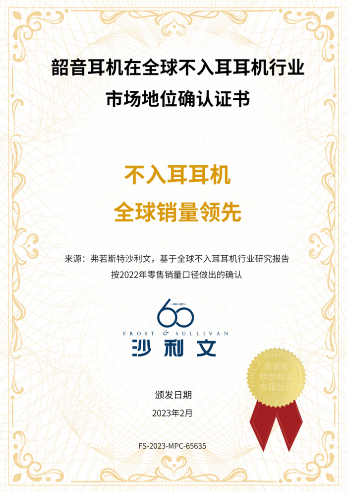 领先的技术创新、强竞争力的产品、良好的用户口碑、精准的用户群体,诸多优势实现了韶音的跃进式发展。近三年以来,韶音中国区市场的增速高达172%。根据专业机构IDC调研数据显示,2020年到2022年间,韶音中国区蝉联骨传导耳机市场出货量和销售额桂冠,在2022年更是取得了71.4%的市占率。海外市场亦如此,Shokz韶音的不入耳耳机产品目前已经在全球超过60个国家和地区有售,门店数量超过2万家,全球用户超过1000万人。据全球权威机构沙利文在2023年2月最新发布的报告显示,Shokz韶音在不入耳耳机全球销量领先。