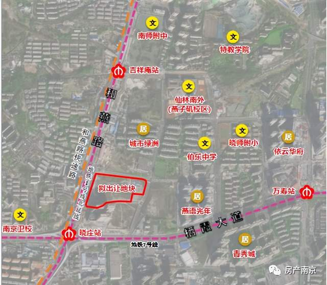 地块东南角规划一处12班幼儿园,200米范围内已有仙林外校燕子矶校区、晓庄小学及伯乐中学,可充分满足片区教育配套需求。地块南侧为晓庄国际广场、所在片区北侧规划有商业综合体:北侧现有1处基层社区中心,可为周边居民提供便利的公共生活配套。地块西侧毗邻和燕路、栖霞大道及过江隧道,区域内规划有密集的次干路与支路网,机动车出行十分便利。地块邻近地铁晓庄站,为地铁1号线北延及7号线换乘中心,轨道交通出行优势显著。地块西侧和燕路快速化已建成通车。(具体情况以正式公告为准)