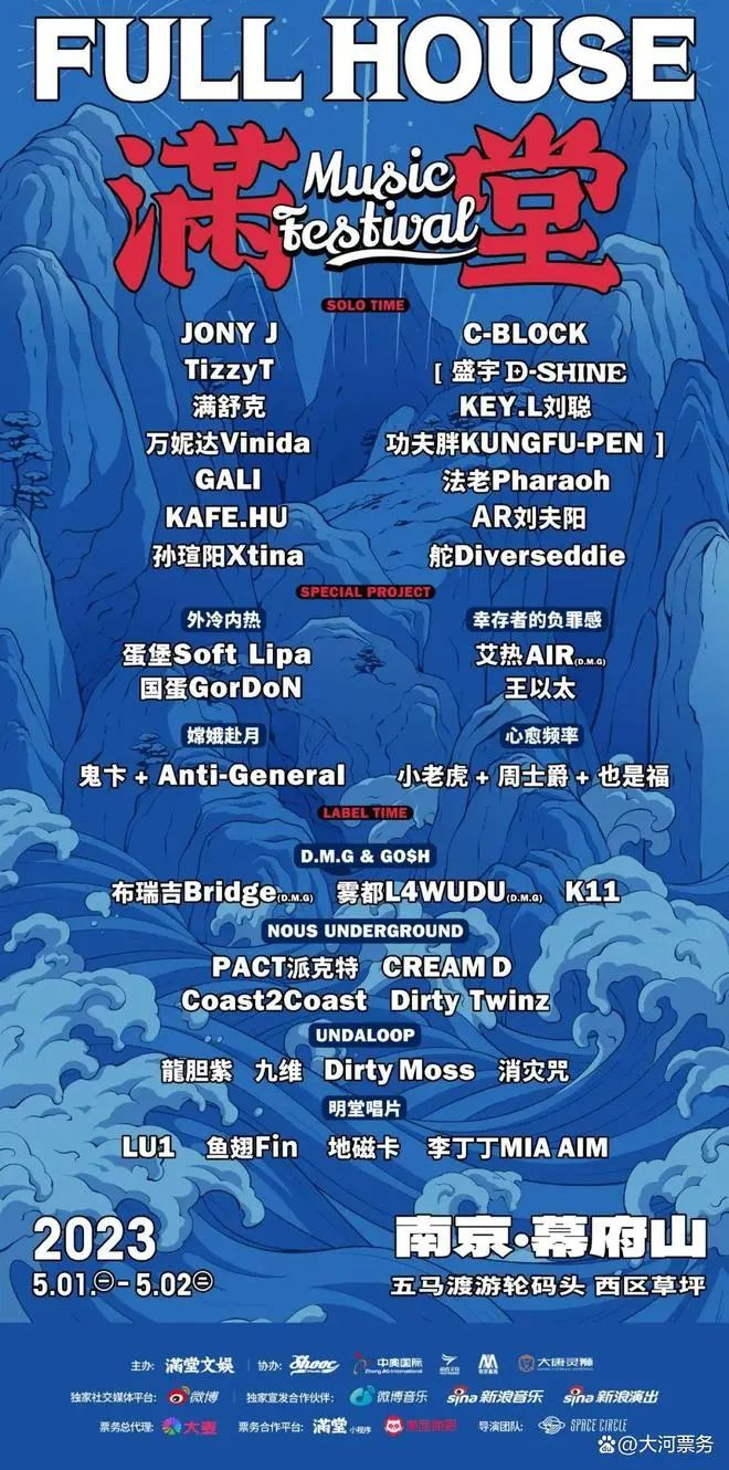 作为后起之秀,满堂音乐节是由说唱音乐人JONY J及厂牌团队Shooc自己主办的说唱音乐节。除了Jony J团队,满堂文娱的背后有江苏中奥体育和苏州步步高投资的背景。满堂音乐节的主题和视觉都取金玉满堂之意,现场会采用独有的个唱(solotime)和厂牌表演环节吸引观众。