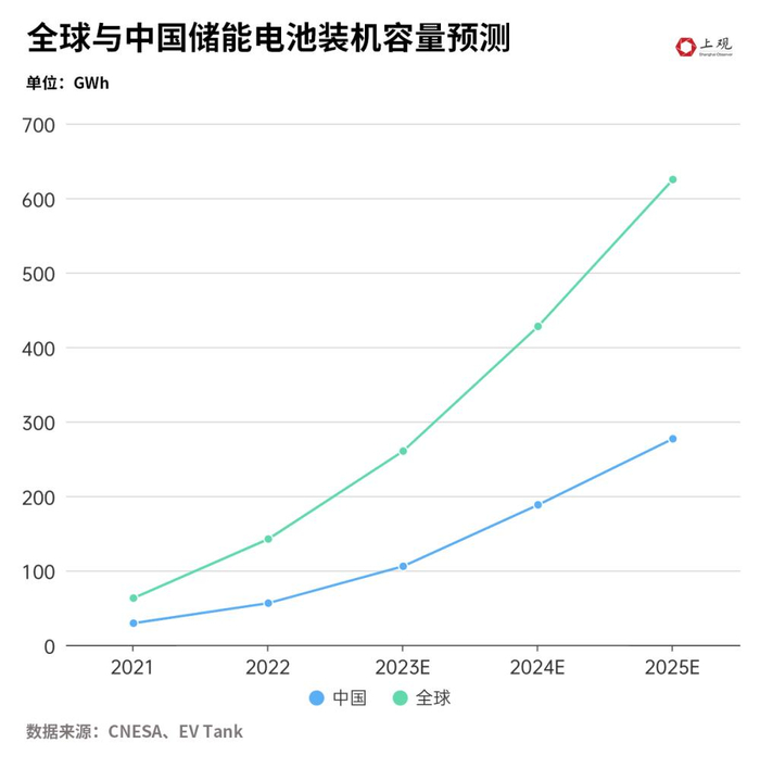 中国锂电池储能产业正在快速扩张。根据中关村储能产业技术联盟和EV Tank的预测,2025年中国储能电池装机容量将达到276.8吉瓦时,占全球近45%。当前,国内传统锂电池龙头企业,如宁德时代、比亚迪、亿纬锂能等,在储能方面多有布局。