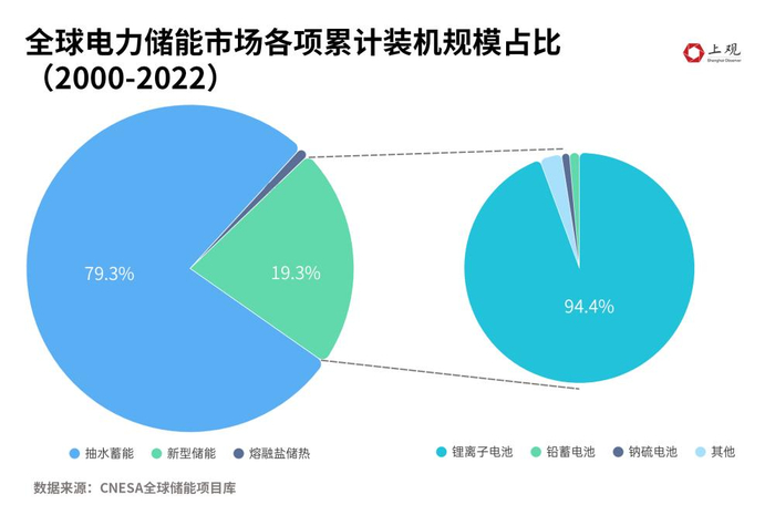 传统储能产业大多利用水势高低差进行抽水蓄能,这也是目前全球储能的主要方式,占比近八成。但抽水蓄能受地理资源约束明显,一般只能建造在山区与丘陵地带,且建造成本高、时间长。随着新能源产业的不断发展,以锂电池储能为代表的新型储能产品技术逐渐成熟、成本下降,迎来了大规模商业化的时机。