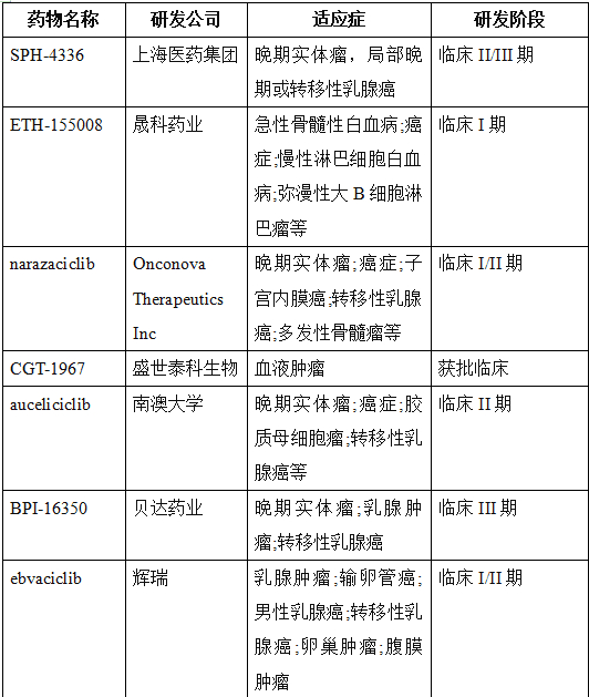 除了这5款已上市的药物外,国内外还有很多企业纷纷布局CDK4/6抑制剂的开发,下面介绍一些代表性药物。