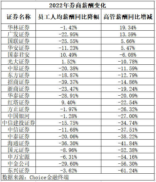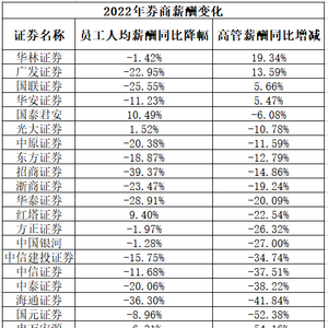 中小券商华林证券高管薪酬也实现了较大幅度上涨。2022年,高管薪酬同比上涨19.34%,但员工人均薪酬下降了1.42%。
