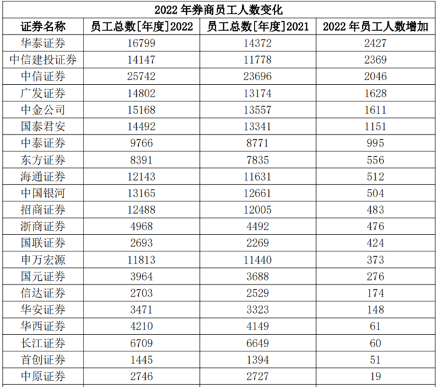 值得注意的是,尽管券商在2022年出现了普遍的业绩下滑和薪酬下调,但是员工人数却在逆势扩张。在可比的32家上市券商中,员工人数增加的券商有24家。其中,六家头部券商的员工增加人数超过了1000人。不过,这样的人员增加规模远远小于2021年。