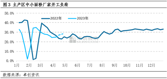 3月面粉供应宽松,下游需求较为低迷。3月原粮小麦价格走低,下游经销商担忧面粉价格跟随下降,补库心态谨慎,拿货不积极,整体面粉供过于求,面粉厂家接单平平,开工负荷持续下降。据卓创资讯数据,3月底面粉厂家开工负荷为24.4%,较月初下降5个百分点左右。
