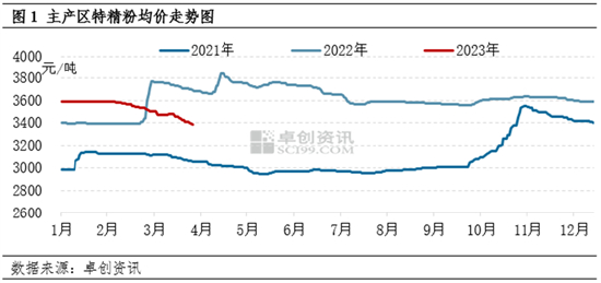 以面粉代表性规格特精粉价格走势来看,3月上旬面粉价格逐步走低,中旬厂家报价止跌趋稳运行,下旬价格继续下探刷新年内新低。据卓创资讯数据监测,3月主产区特精粉均价为3460元/吨,较上月下降2.98%,主要原因是原粮小麦价格走低,一方面厂家原粮成本下降,挺价意愿松动,竞争降价走货;另一方面,面粉经销商看空后市,拿货不积极,下游需求平淡。