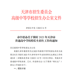 普通高中学校招收体育、艺术、科技特长生须执行市教委下达的《2023年天津市普通高中本市生源特长生招生计划》,面向全市招生。