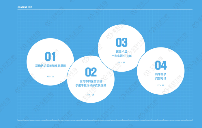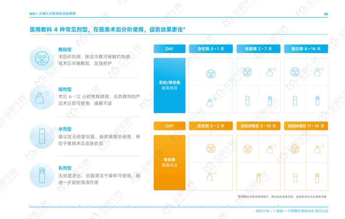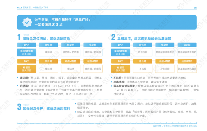 绽妍携手丁香园和中国整形美容协会共同推出《医美术后科学修护指南》,所谓「三分医美七分修护」,指南里有各类医美术前术后的防晒、修护攻略,还贴心附上修护日历,手把手教你医美前后的实用护肤技巧。