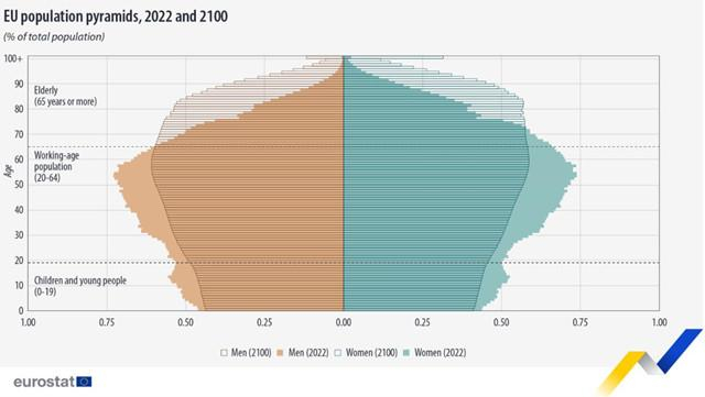 欧盟统计局表示,2022年欧盟人口结构已经呈现出长寿命、低死亡率和低出生率的特征,2100年欧盟人口结构预计将继续向人口总数缩减和老龄化方向发展。