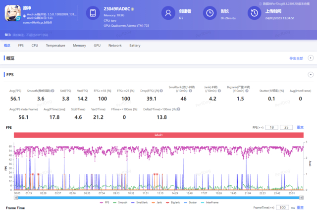 游戏方面,在《原神》720P分辨率下,Redmi Note 12Turbo半小时游戏中,平均帧率达到了56.1fps,对于这个价位的产品来说,这样的性能表现和持续高性能输出的能力,确实称得上“质的提升”,水平不输旗舰。