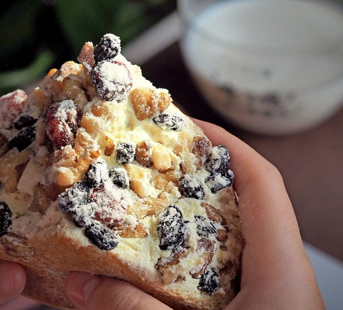先是海啸一般的奶味占领整个口腔,接着是坚果的香、黑加仑的甜、蔓越莓的酸、面包的韧……
