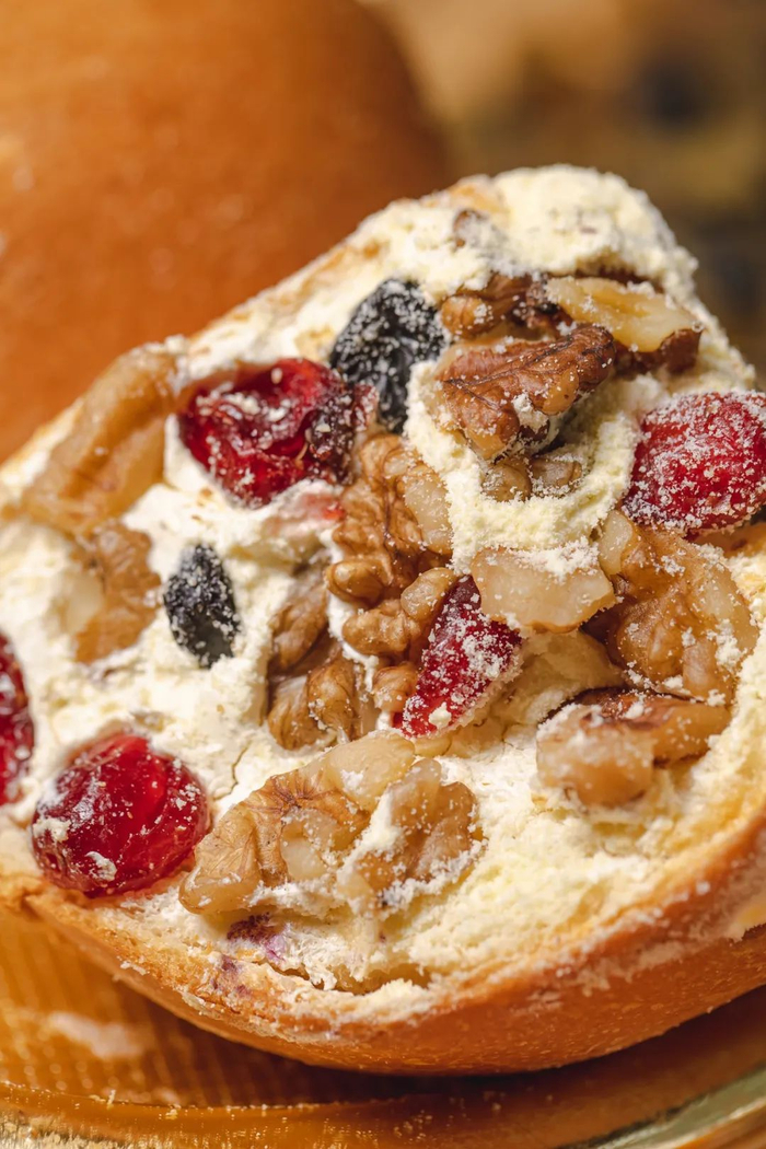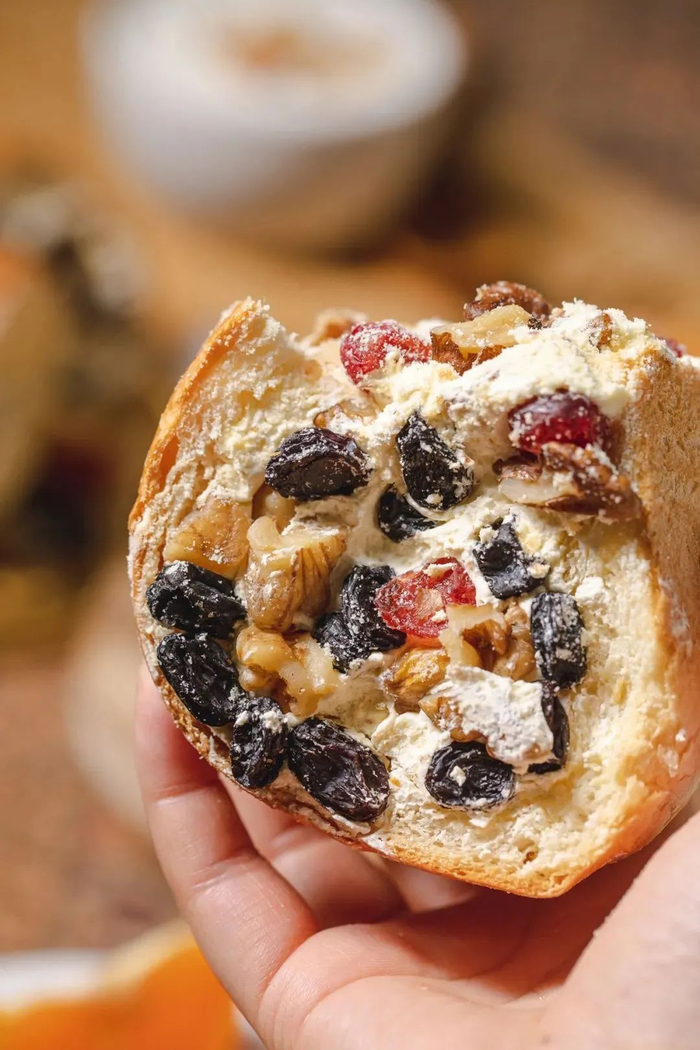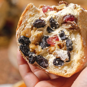 大颗大颗的新疆核桃肉、甜蜜的新疆黑加仑干,还有活泼跳跃的蔓越莓干密密麻麻地铺在奶酪上,都快兜不住往下掉了~