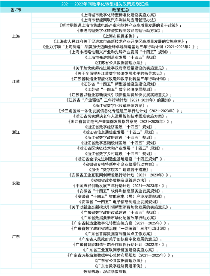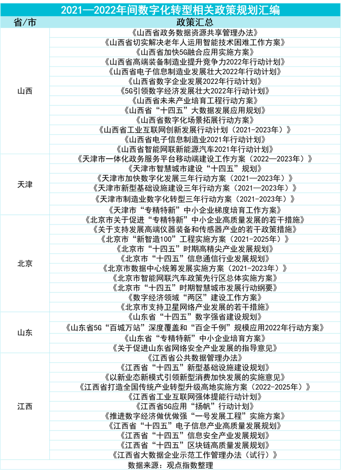 对此,观点指数对全国各省市近年来的数字化转型相关政策规划进行系统整理,为各地区、各行业的不动产相关A企业开展数字化转型以及把握大趋势中的机遇提供参考和借鉴。