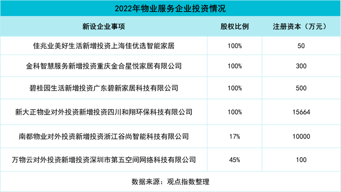 2022年,物业服务企业在智能家居方面的投入相对较多。据观点指数不完全统计,佳兆业美好、金科智慧服务分别新增对外投资1项家居科技公司,经营范围涵盖普通家居和智能家庭产品的销售、制造等。