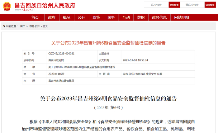 新疆昌吉州市场监管局抽检食品314批次 不合格7批次