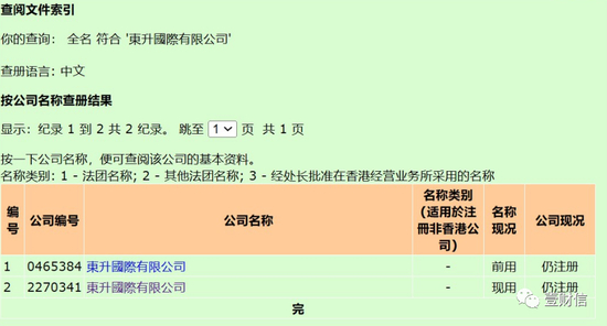 同时在香港注册处官网上搜索“東升國際有限公司”,搜索结果显示现用该名称的公司也仅有一家,公司编号为2270341,企业成立时间为2015年8月3日,与一轮问询回复第75页的说法一致。