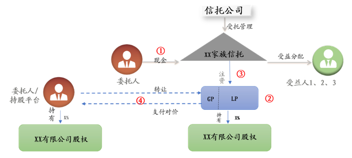 委托人(或其指定主体)作为有限合伙的GP管理人,可实现企业经营指令的高效下达与执行,避免信托公司实质参与或干扰家族企业经营,同时也是为了维持企业持股的稳定,隔离经营风险向上传递。