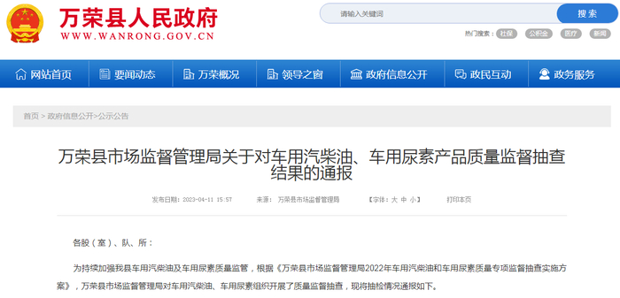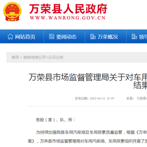 山西省万荣县市场监管局通报车用汽柴油、车用尿素产品质量监督抽查结果