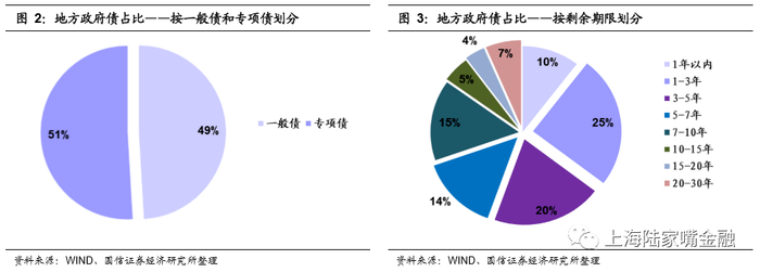 按照用途来看,截至2020年底,一般债占比51%,专项债占比49%。按照剩余期限来分,剩余期限在1-3年的地方债最多,占比25%,其次是3-5年,占比20%。