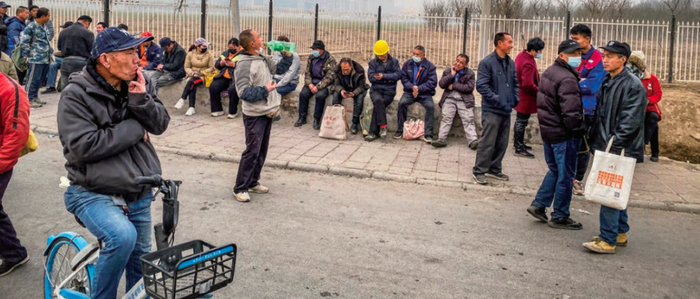 在北京市通州区马驹桥镇“劳务一条街”,没找到活儿的工人在劳务中介处寻找工作机会。