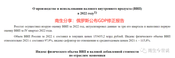 与其他国家类似,俄罗斯统计局也在近期公布了“2022年经济核算修正报告”,将按市场价格计算的名义GDP由之前的1514556亿卢布,上调至 1534352亿卢布——又拔高了1.98万亿卢布。