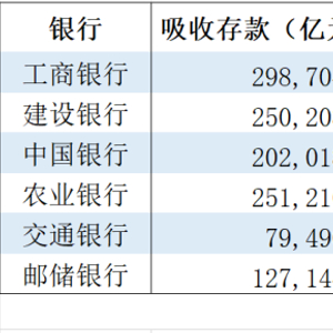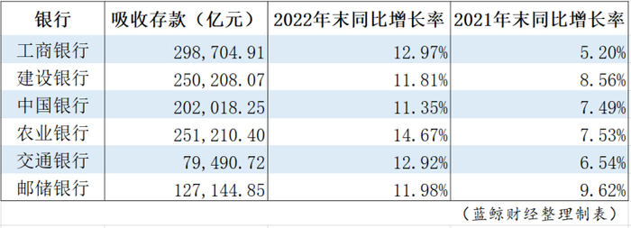 国有大行向来是揽储大户,去年全年,六大行的客户存款总额保持了高速增长。截至2022年末,六家国有大行吸收存款总额120.88万亿元,同比增长12.69%,且六家银行的存款总额同比增长率皆达到了两位数,增速明显加快。其中工行吸收存款最多,为29.87万亿元,同比增长12.97%。