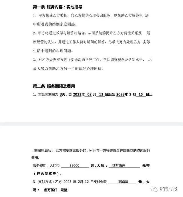 相比前两份合同,第三份合同费用高达35000元,其中包含情感老师的差旅费。服务期仅有3天。服务内容多了一项“对夫妻双方进行实地沟通指导工作,帮助调整观念及认知水平,尽最大努力帮助另一半疏导心理困扰”。