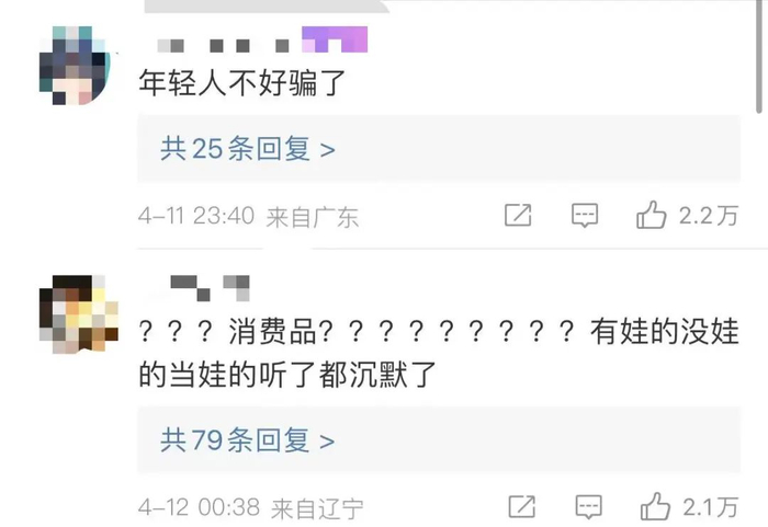 对此,网友表示:“年轻人不好骗了”,“建议专家多生少说”,“消费品?有娃的没娃的当娃的听了都沉默了”……