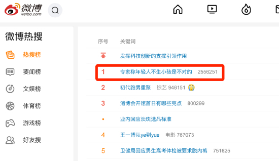 4月12日,多个关于“生小孩”的话题登上微博热搜,引发关注。其中#专家称年轻人不生小孩是不对的#登上微博热搜第一,引发关注。