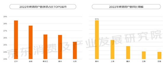 而啤酒更受东北人青睐。报告显示,啤酒购物用户数渗透占比(啤酒/当地酒类),辽宁、吉林、黑龙江进入前三甲,之后是贵州和北京。而从增速来看,贵州、上海、重庆、云南和安徽等省市表现不俗。
