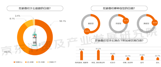 在白酒方面,关于香型,根据京洞察调研数据显示,53%的消费者选择酱香型,23%选择清香型,19%选择浓香型。在白酒度数选择上,50度以上的占比达56%,40-49度占比33%,这说明度数越高,产品越受欢迎。
