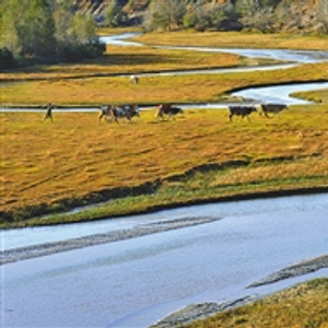 我时常想起陪朝鲁门姨夫在养蓄牧河边放牛的情景,虽然朝鲁门姨夫把纯手工擀制的山羊毛毡子给我铺上,还是有潮气让衣服粘在身上。这时,喝了酒的朝鲁门姨夫,早已进入梦乡,而且鼾声如雷,我更睡不着了。我索性就坐在窝铺的门口看星空,那种感觉很奇妙,虽然星星离我们那么远,但连在一起的星座到银河就使得夜空显得壮阔了。在浩瀚星空下的位于原野上的朝鲁门姨夫孤零零的小窝铺,就像大海中漂泊的小舟,那么渺小。当晨曦来临的时候,风渐渐停息了,远处的雾岚里地平线上露出鱼肚皮白,太阳将要露头,传来养蓄牧河的流水声。窝铺外各种青草和野花上面是密密麻麻的露珠,像一座座宫殿,里面一定住着一颗颗昨夜的星辰。围栏里的牛开始此起彼伏地叫了,打开围栏的门,我甩着长鞭,一个一个放它们出来,防止它们相互顶撞,不一会,一群牛就自由自在地在养蓄牧河畔吃草了。这时,朝鲁门姨夫也做好了饭菜,在窝铺上吃饭特别香,一样的饭菜在家里就吃不出在窝铺的味道。朝鲁门姨夫喝酒也是,平时在家也就半斤的量,在窝铺能喝一斤,还喝得甜嘴巴舌的。吃完早饭后,我和朝鲁门姨夫追随牛群去到养蓄牧河边。这时太阳升起来了,河面上波光粼粼,喝足水的牛站在河里,甩着尾巴驱赶蚊蝇。在太阳光的照射下,牛身上就像披着绸缎一样。各种颜色的牛像一匹匹多彩的绸缎,装饰着养蓄牧河畔。