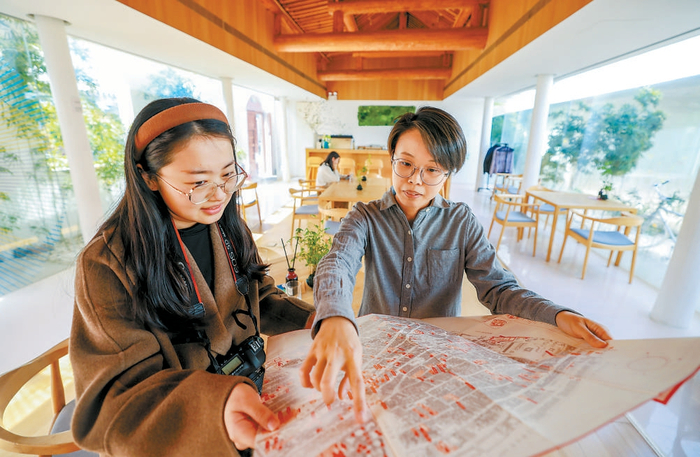 何佩珊已经成了“北京前门通”,她正在向住店客人介绍周边景点。