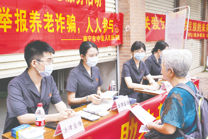 青秀区人民法院成立广西首家法院驻老年大学、老年人活动中心宣传教育基地,向老年人提供法律咨询。