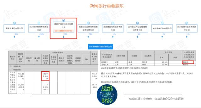 数据显示,截至2022年末,新网银行总资产突破800亿元至848.20亿元,较2021年末的571.16亿元增长48.50%;股东权益由2021年末的57.54亿元增加至64.34亿元。根据红旗连锁的持股比例及会计处理方法(权益法)不难推出新网银行的相关指标(见下图)。