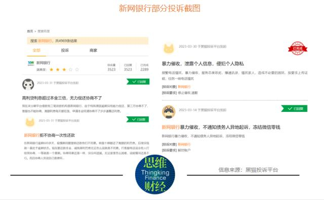 截至4月11日,在黑猫投诉平台上搜索“新网银行”,投诉内容多达4969条,其中主要以“高额利息”和“暴力催收”为主,黑猫投诉平台显示,有用户表示遭到不同程度的威胁与恐吓,“新网银行催收手段很恶劣”(见图)。