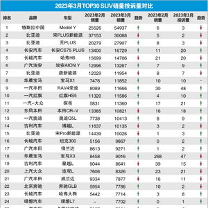 在3月份的SUV车型的质量问题中,“影音系统故障”依旧排名首位,但投诉量环比有所回落,较2月份下降9.8%。本月“发动机/电动机漏油”投诉量环比出现翻倍增长,排名升至前十位,投诉增量来自于部分自主品牌车型。在服务问题中,“与宣传不符”投诉量迎来反弹,环比上涨76.6%,投诉集中在部分德系和自主品牌车型。去除投诉人自愿申请撤诉的信息后,2023年3月TOP30 SUV销量投诉量排名如下: