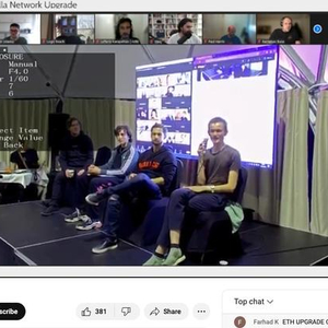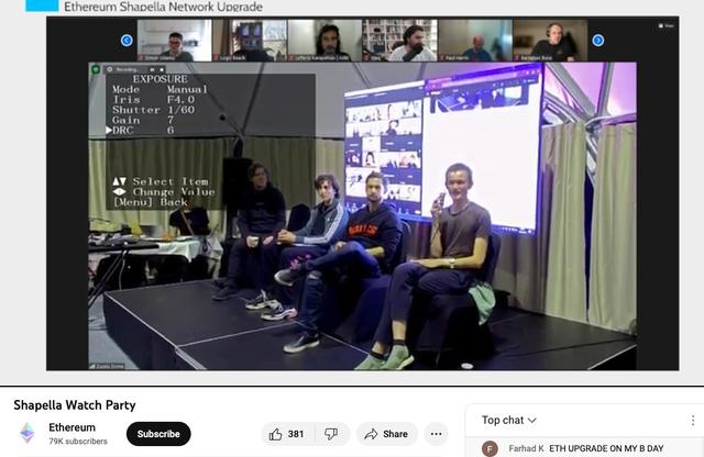 以太坊创始人Vitalik Buterin(最右)在“上海升级”观看派对上发表讲话。