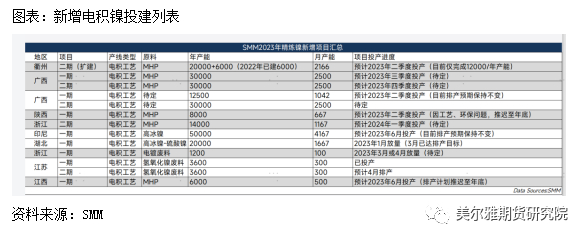 梳理新增投建计划,未来合计产能近20万吨,原料主为MHP、高冰镍及硫酸镍。生产工艺主为电积工艺,目标市场为不锈钢、低端合金。但受2023年沪镍下行所影响,中间品及硫酸镍生产电积镍利润缩窄,部分企业排产计划推迟。