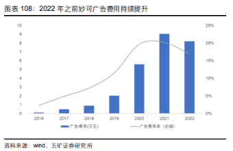 销售费用细化来看,2022年妙可蓝多实现广告促销费8.22亿,占销售费用比例为67.42%。数据往前一年,2021年,公司实现广告促销费9.06亿,占比78.18%。根据五矿证券研报显示,2022年之前妙可蓝多广告费用持续提升。