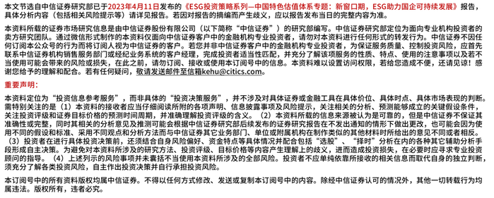 二十大以来,国企迎来全面发展的新窗口期,央企平均PE由2022年11月初的46倍上升至2023年3月底的53倍。ESG主题与国企长期可持续发展的精神契合,ESG评价是把握本轮国企全面发展红利的抓手。MSCI ESG评价体系和中证ESG评价体系均可与国企可持续发展价值对标,国内机构ESG一致性评价过去6年间最大多空组合收益率达25.91%。我们以公司治理为本,以绿色、负责任的高质量发展为纲,构建了包含30个三级议题的中信证券国企ESG评价体系。